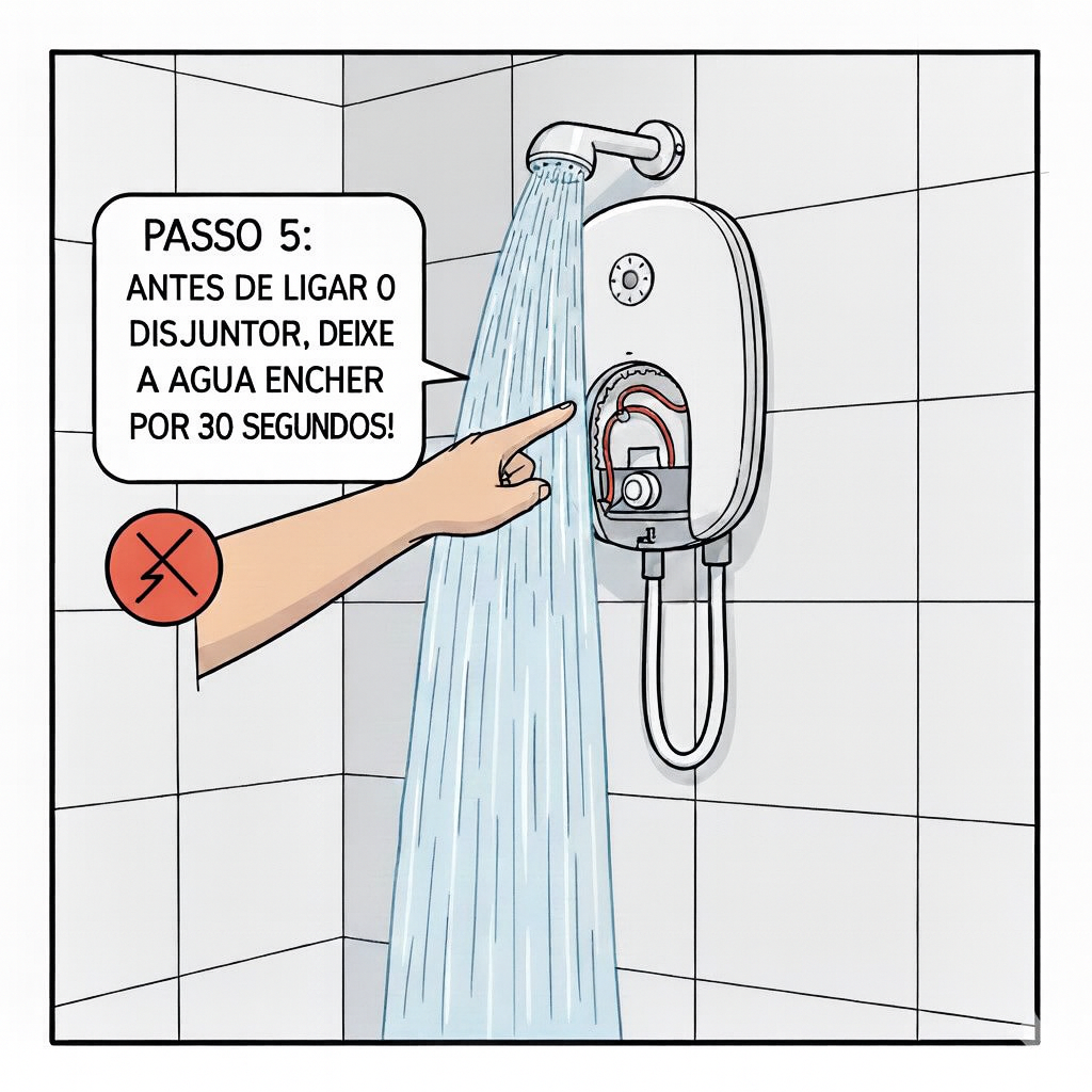 Abra o registro e deixe a água fria correr pelo chuveiro por 30 segundos. Isso é obrigatório para expulsar o ar e preencher a câmara. Se ligar a energia com a câmara vazia, sua resistência novinha vai queimar!