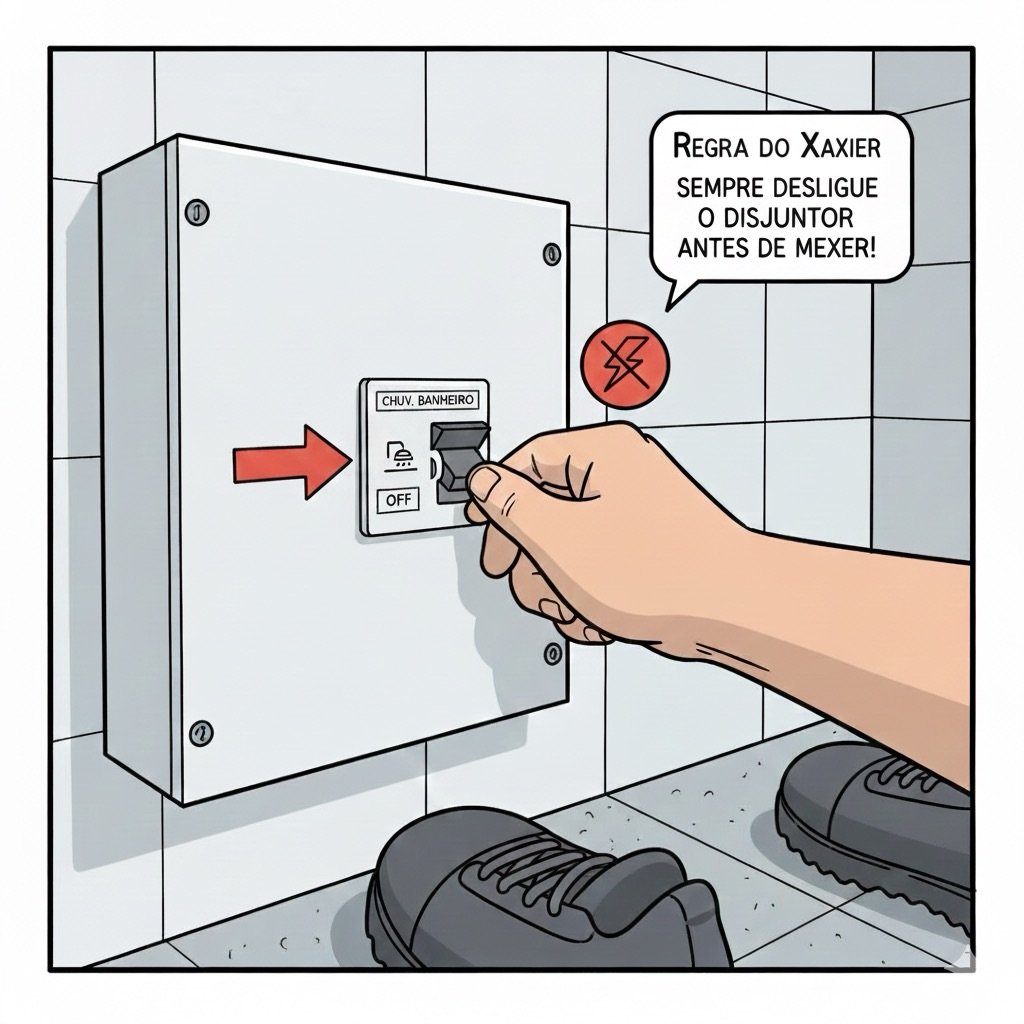JAMAIS mexa no chuveiro com o disjuntor ligado. Não importa o quão rápido seja o serviço.